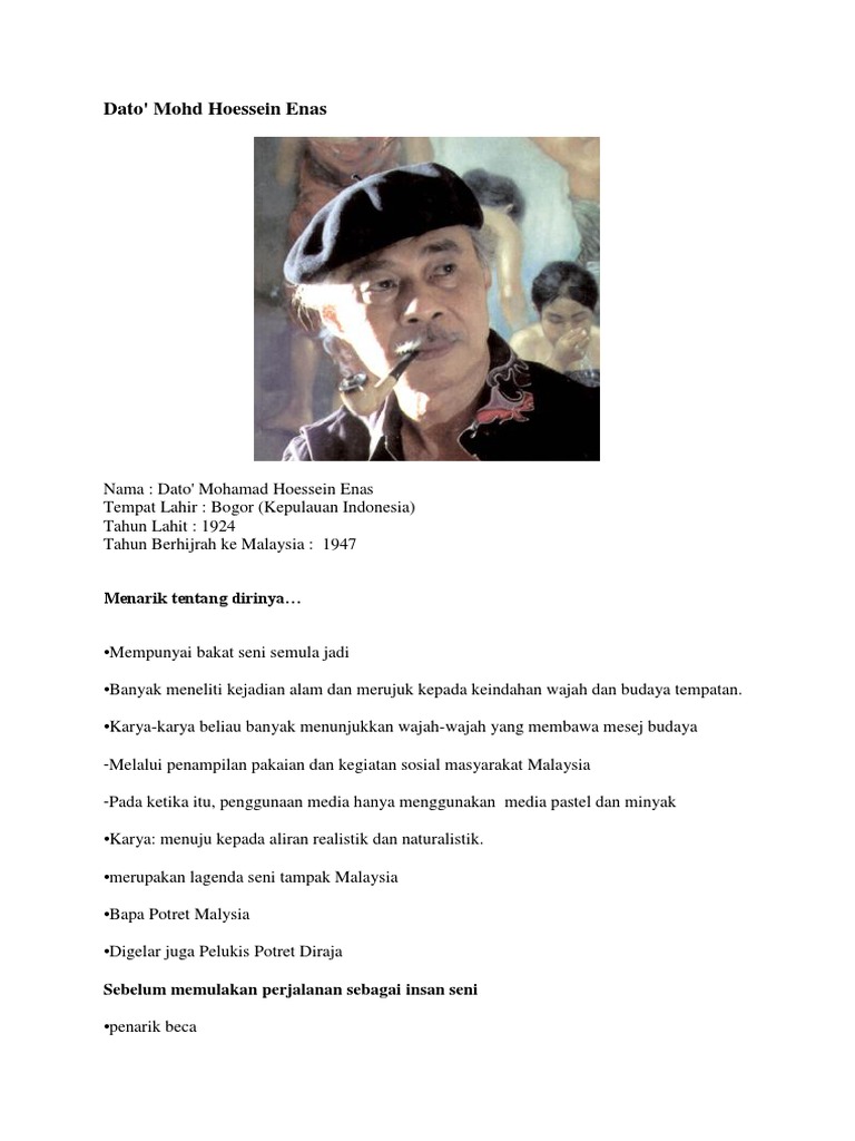 In oil or pastels, the models are mostly nubile village girls from different backgrounds like from kedah, selangor, tribal. Ketibaan mohammed hoessein enas dari indonesia telah membawa era baru dalam aliran naturalis dengan melukis figura manusia kepada pelukis tempatan.tay hooi keat yang baru pulang dari united kingdom memperkenalkan asas seni lukis seperti bentuk, garisan, rupa, warna, jalinan dan sebagainya. Hoessein enas, terdapat tiga aspek penting dalam membuat apresiasi. Mohamed hoessein enas is the individual who is big in the world of art in malaysia. Mereka adalah penerima pengaruh yang pasif.